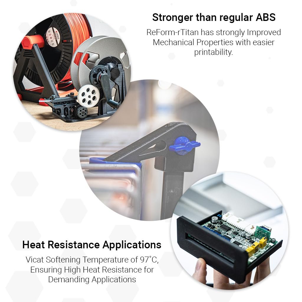 ReForm is a sustainable initiative within Formfutura to efficiently manage residual extrusion waste streams and re-use them into high-end upcycled filaments. The ideology behind ReForm is to a make 3D printing more sustainable – without having to make compromises on material properties – and yet keep it affordable. ReForm rTitan is based on exactly the same unique formulation as our TitanX filament range, but is made out of residual extrusion waste streams which are re-compounded and homogenized into a high-end and FDM/FFF-optimized upcycled TitanX-based filament with significantly less environmental impact. Unique features 100% upcycled/recycled filament with retaining the unsurpassed printing properties of TitanX Less environmental impact by quality controlling and re-using extrusion waste streams Only residual waste streams of TitanX is being re-used, thus pure quality! Sustainable packaging ReForm filaments are spooled on easy to recycle and dispose recycled cardboard spools ReForm filament is packaged in recycled carton boxes FDM/FFF-optimized Warp-free printing Optimized filament flowing behaviour and inter-layer adhesion Excellent adhesion to heated glass plate, Kapton tape, PET tape and Formfutura EasyPad Greatly improved mechanical properties, strength, and impact resistance
