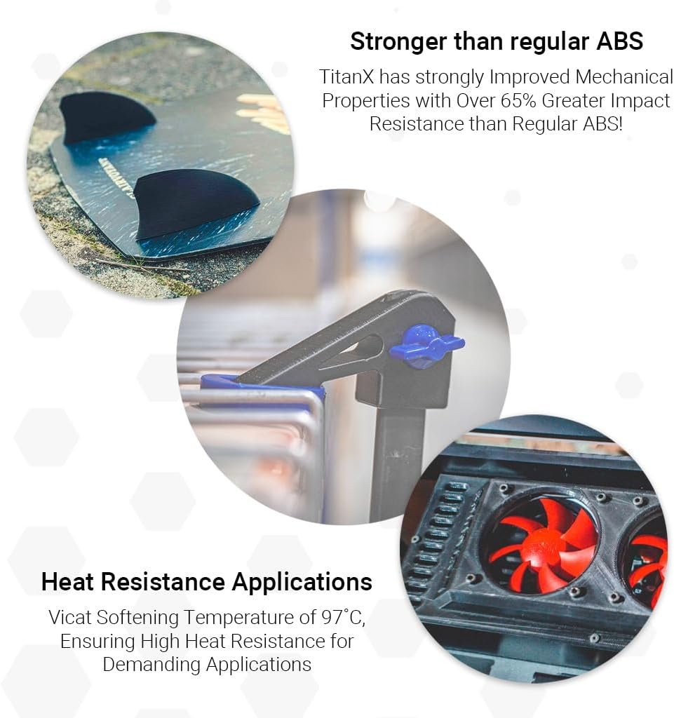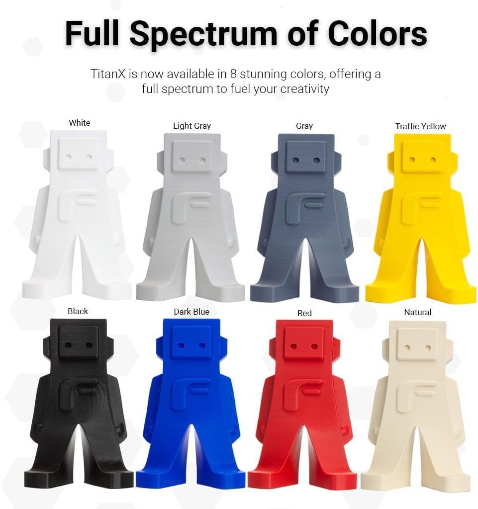TitanX is an industrial-grade, high-performance and FFF/FDM-optimized ABS based engineering filament. TitanX is the evolution of ABS into a warp-free filament with unsurpassed mechanical properties and is extremely suitable for 3D printing large scale and high precision engineering objects. TitanX is truly FFF/FDM-optimized as it has zero warping, a perfect interlayer adhesion and can be printed directly on a heated glass plate without any adhesives or tapes to be used.
