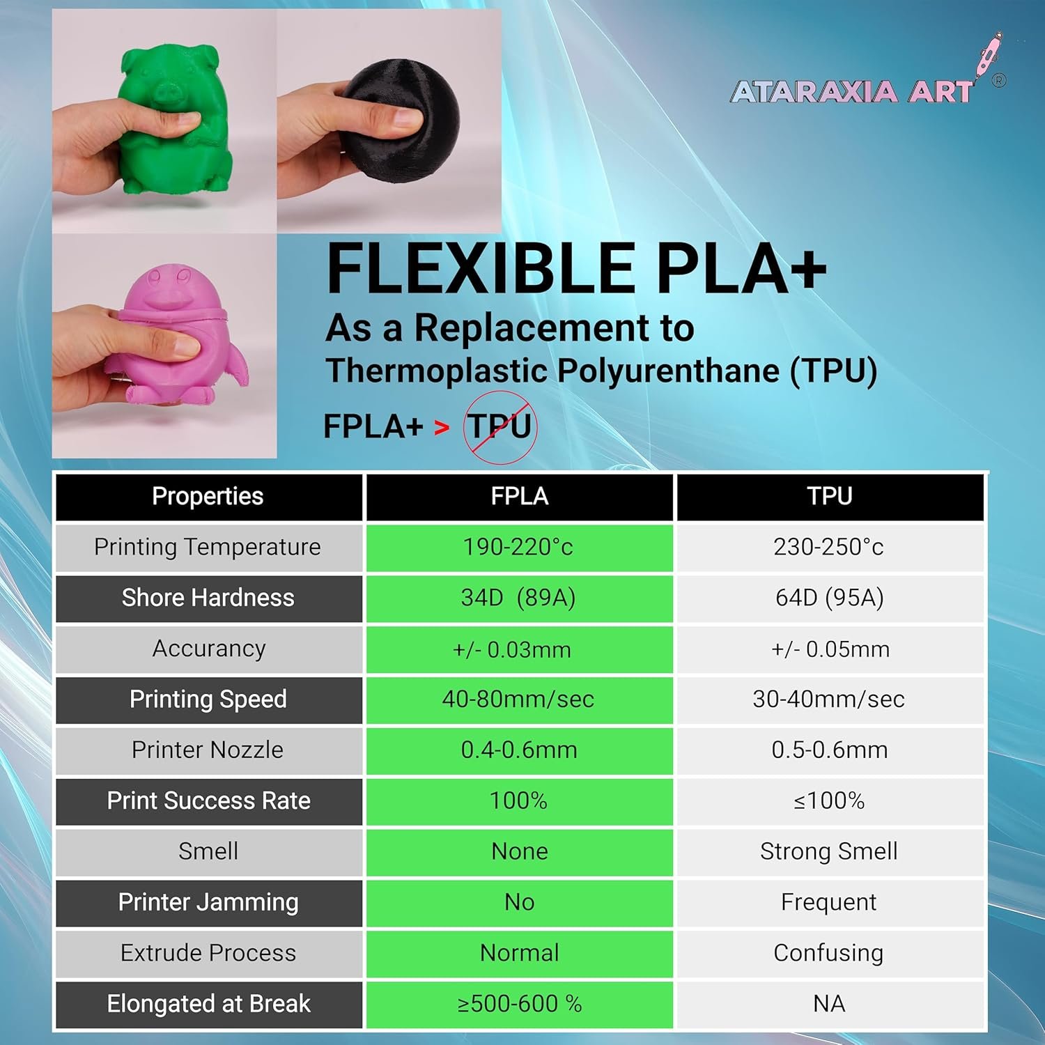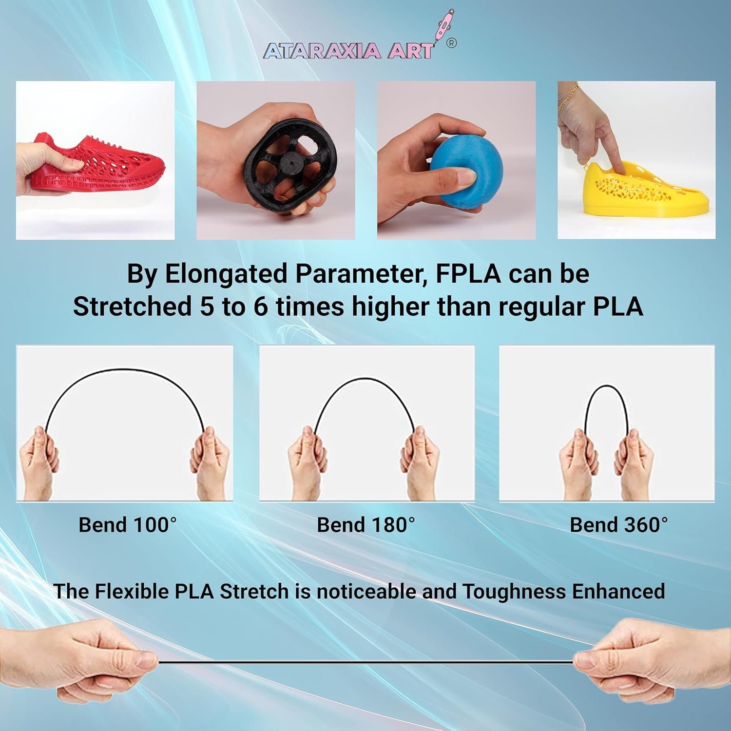 ☀【Patented Flexible PLA Formula & 89A Shore Hardness】 – Ataraxia Art Flexible PLA plus filament is a patented formula that took years to perfect & release. Flex PLA is more flexible than TPU & easier to use. Flexible Pla elongated at break more than is 500-600 % so Flexy filament can be stretch 5 to 6 times higher more than any 3d printer filaments.3d printer filament Flexible PLA is used for great variety of project like shoe insoles, Arts & Crafts, DIY, phone case, gifts, belt & decoration.