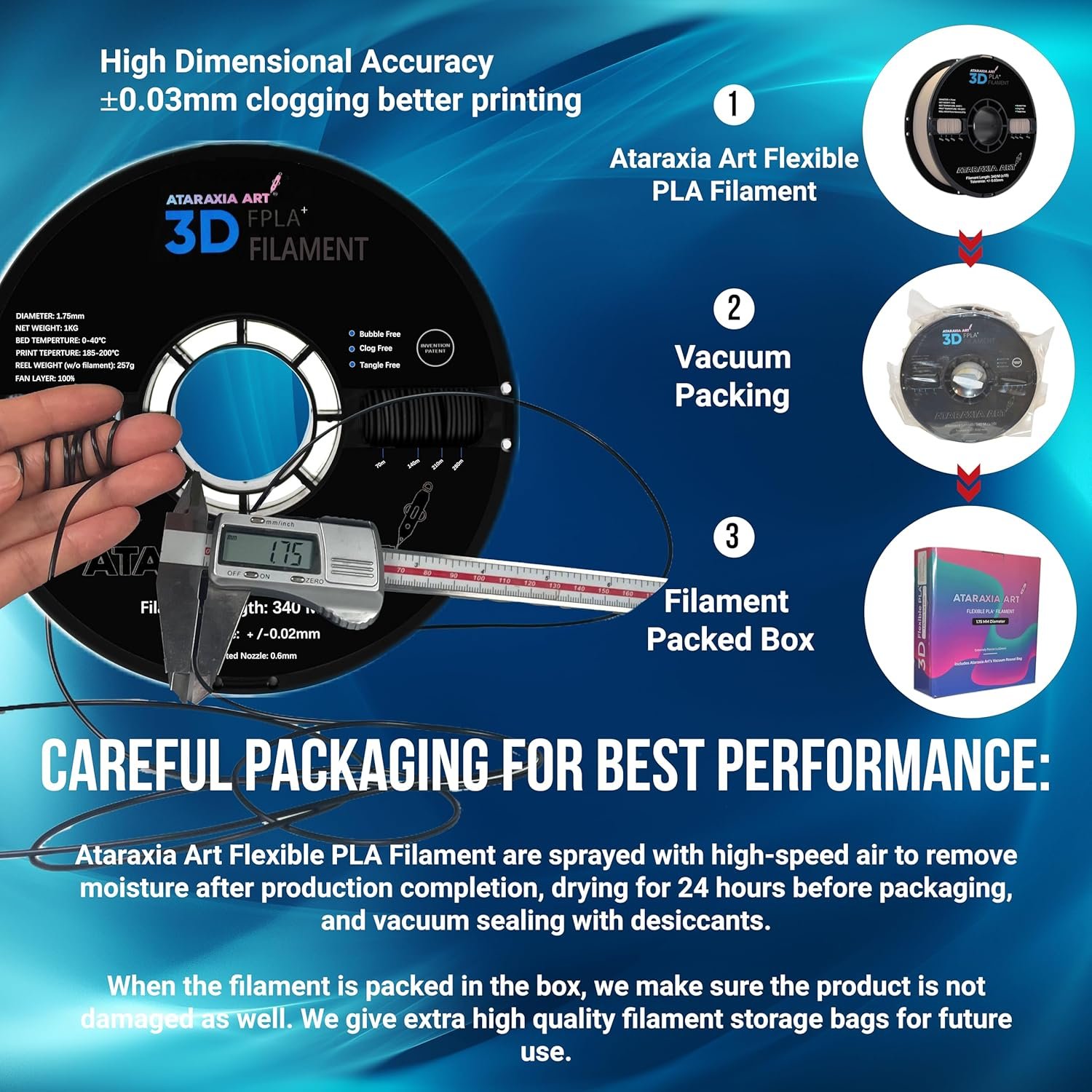 ☀ 【 Clog Free & Bubble Free Flexible PLA Filament 1.75mm 】- All flexible PLA plus filament comes with an innovative formula to keep them tangle free, bubble free and clog free. To protect the moisture of our 1.75mm ataraxia flexible PLA filament, they come in seal packages. please re use our premium filament vacuum resealable storage bags to keep them fresh and prevents oxidizing. Our flexible filament 3D printer filament vacuum storage bags can be used with any vacuum cleaner.