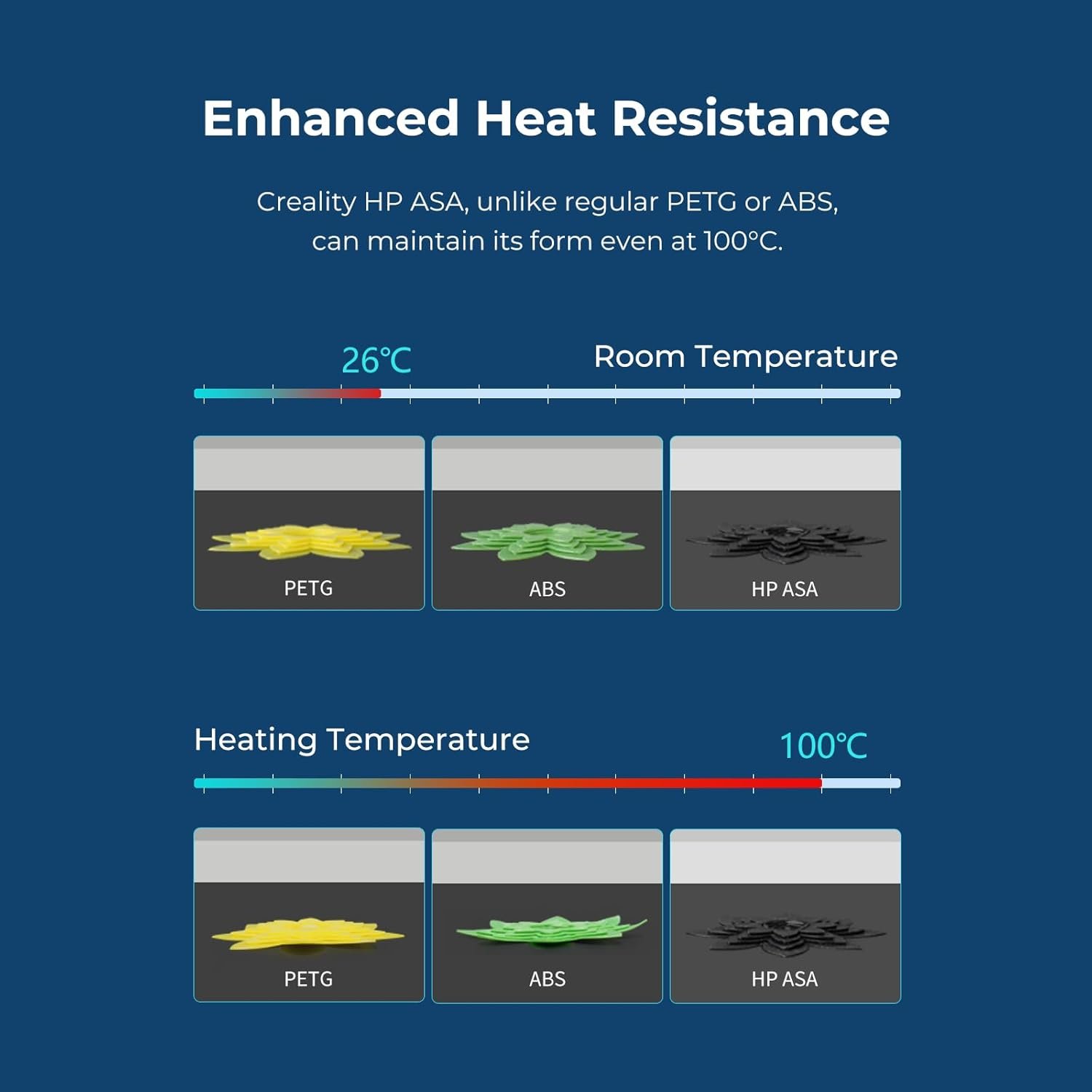 Enhanced Heat tolerance- Creality HP ASA, unlike regular PETG or ABS, can maintain its form even at 100°C