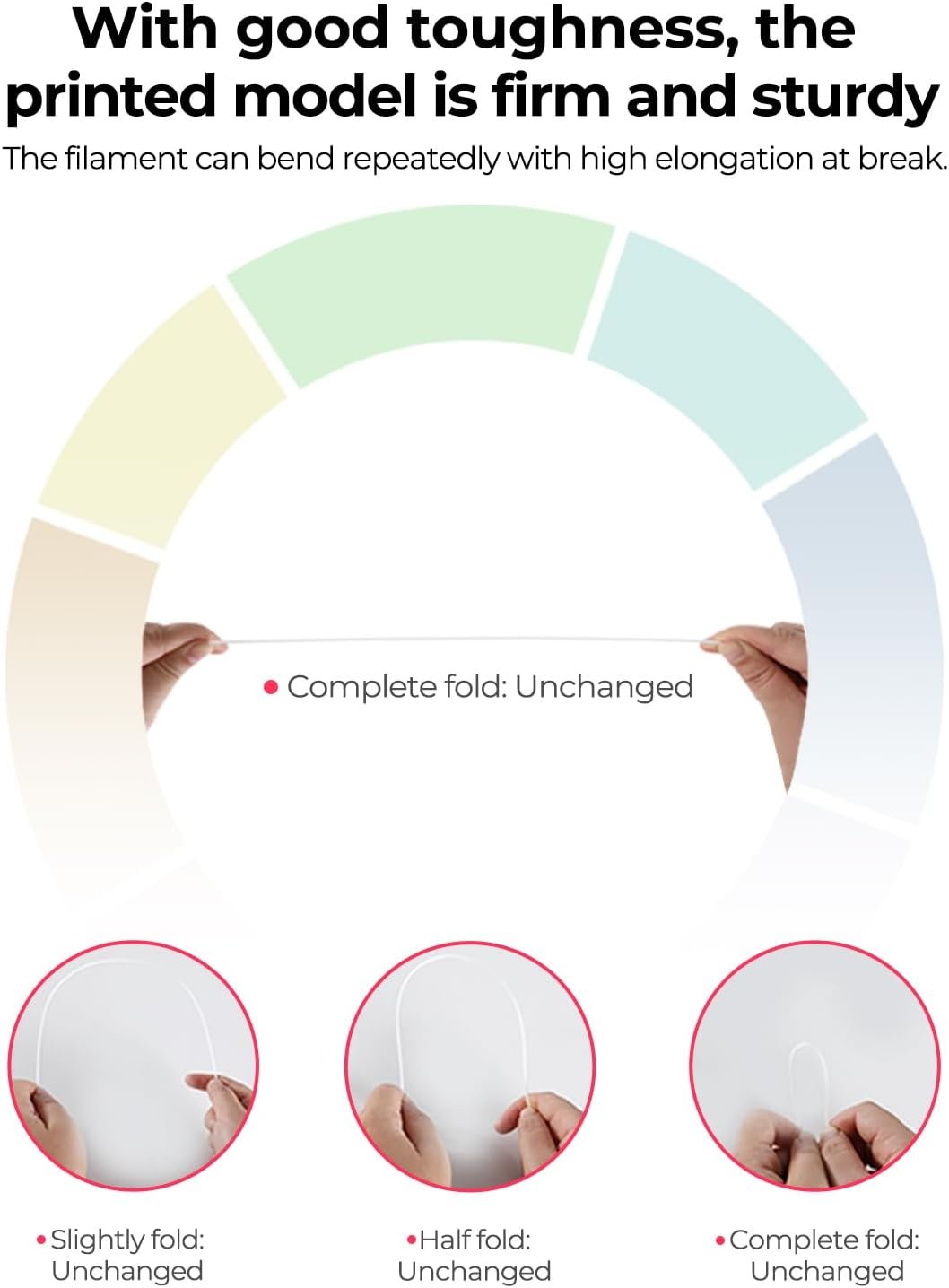High Performance & Strength: PETG filament combines the strengths of PLA and ABS. It offers low shrinkage, high impact resistance, excellent temperature resistance, and high elongation at break, models can bend repeatedly and remain firm and sturdy
