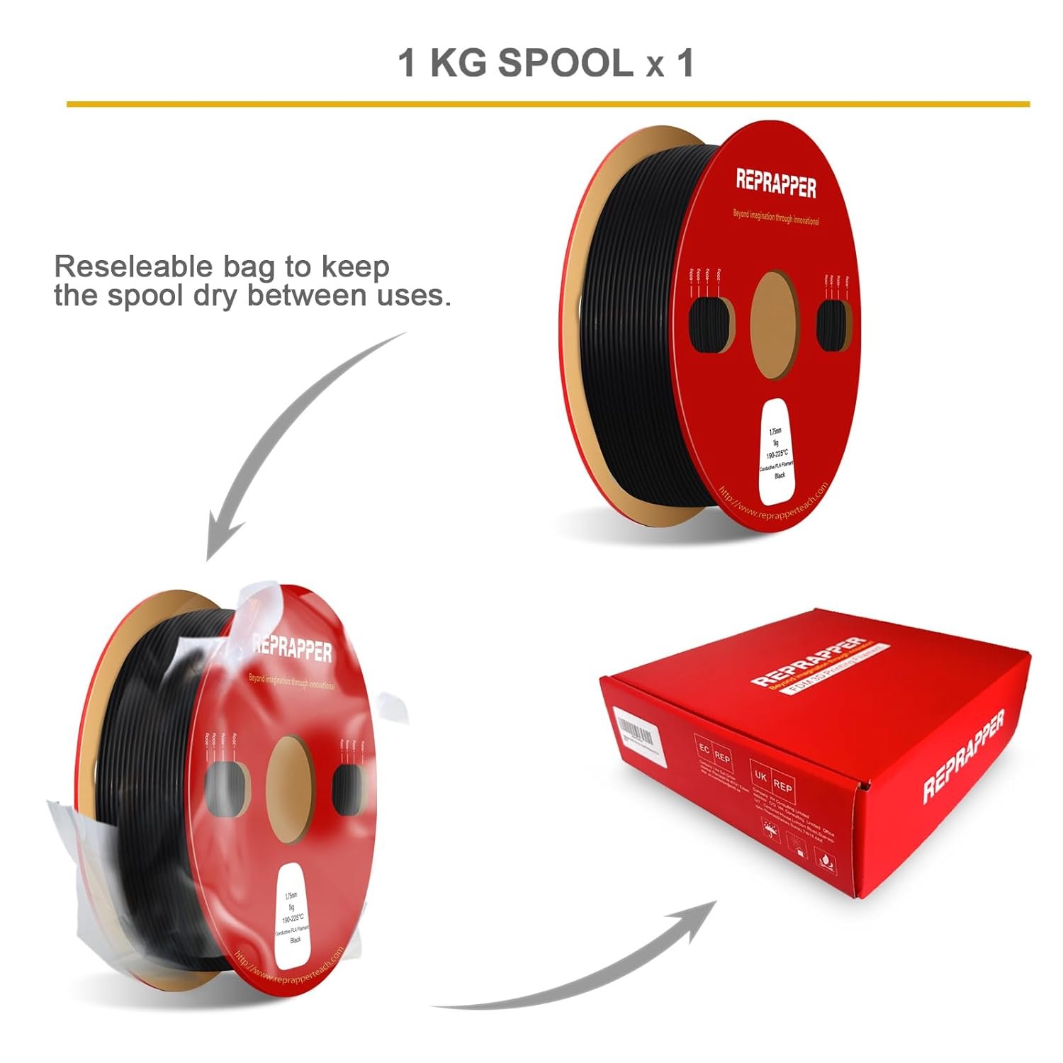 Reprapper Conductive TPU Filament 1.75mm (± 0.03mm) 2.2lb (1kg) for 3D Printer, Electro-Conductive Flexible Filament, Black