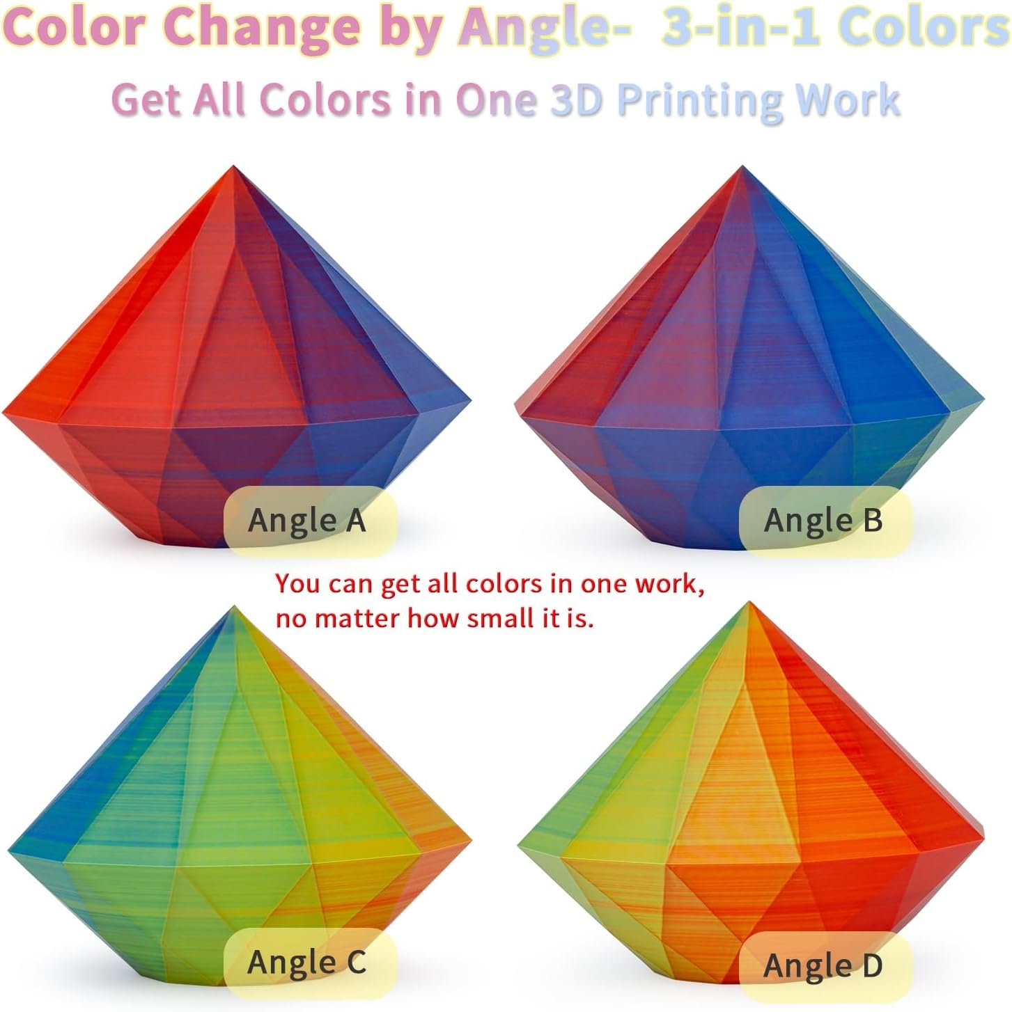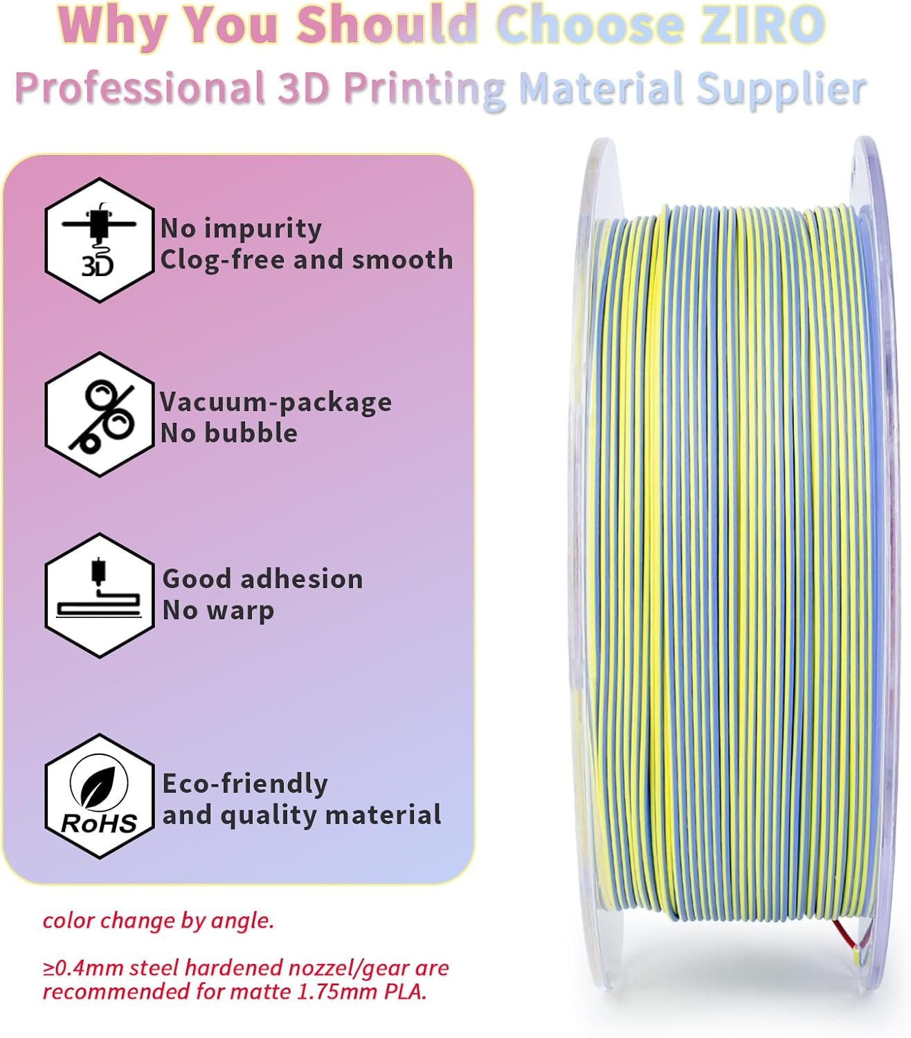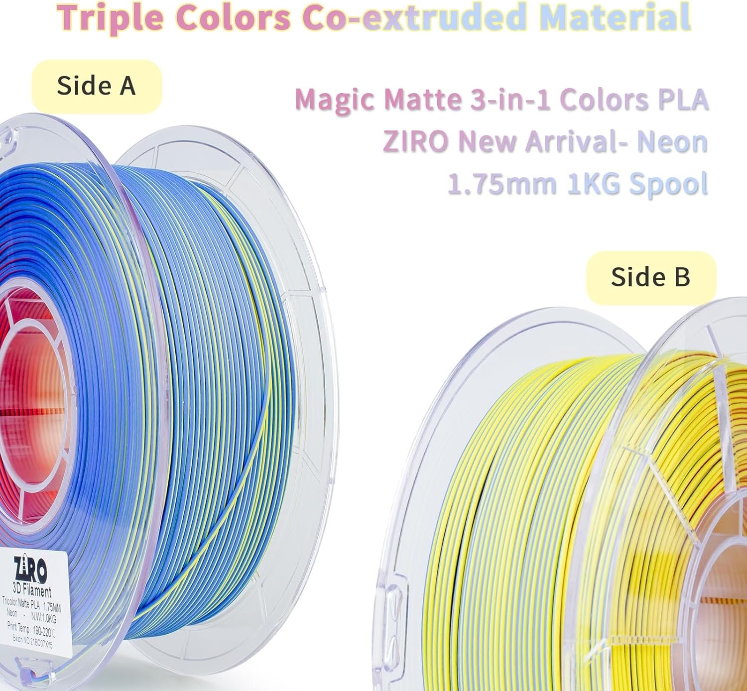 [Matte Tri-colors PLA]- The ZIRO Neon PLA coextruded three colors in one filament. Color changes from a different angle, and you can get magic discolorations on your works no matter how small they are. The matte surface achieves a shine-free, no-gloss, frosted look, giving your 3D works a modern and enigmatic appearance.