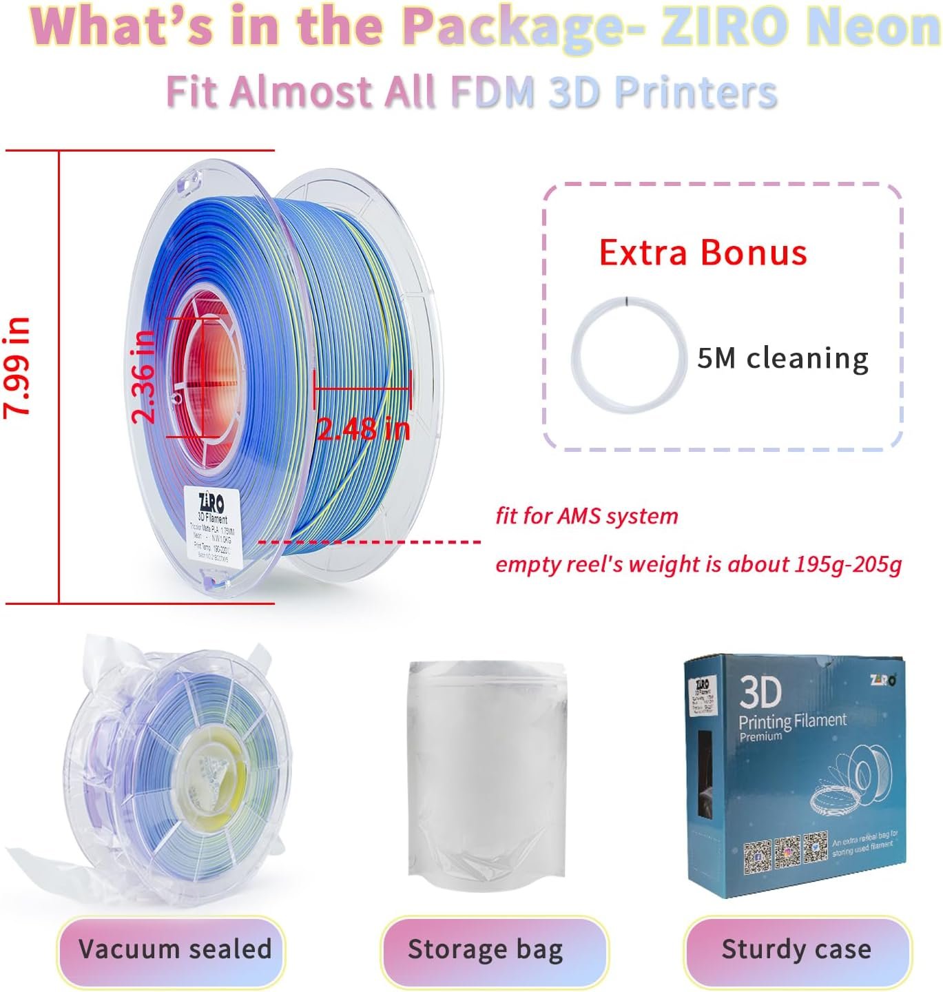 [What You Will Get]- 2.2 lbs Neon PLA filament + a free reseal bag + a 5M cleaning filament. And our friendly customer service.